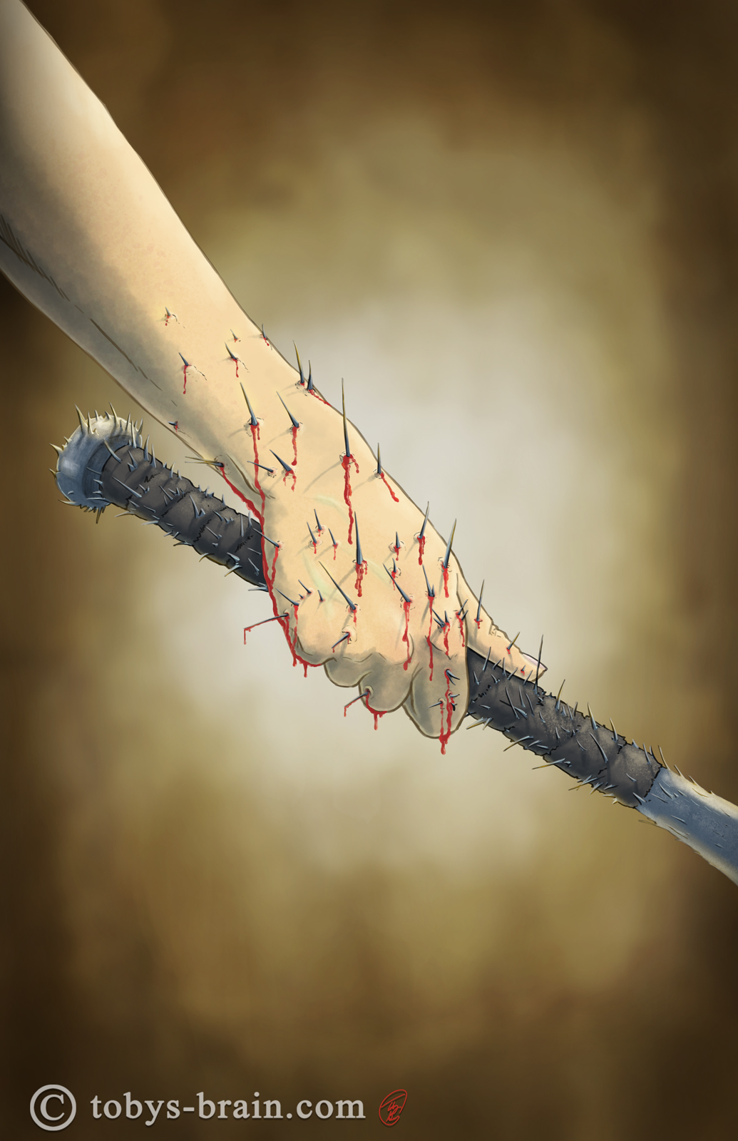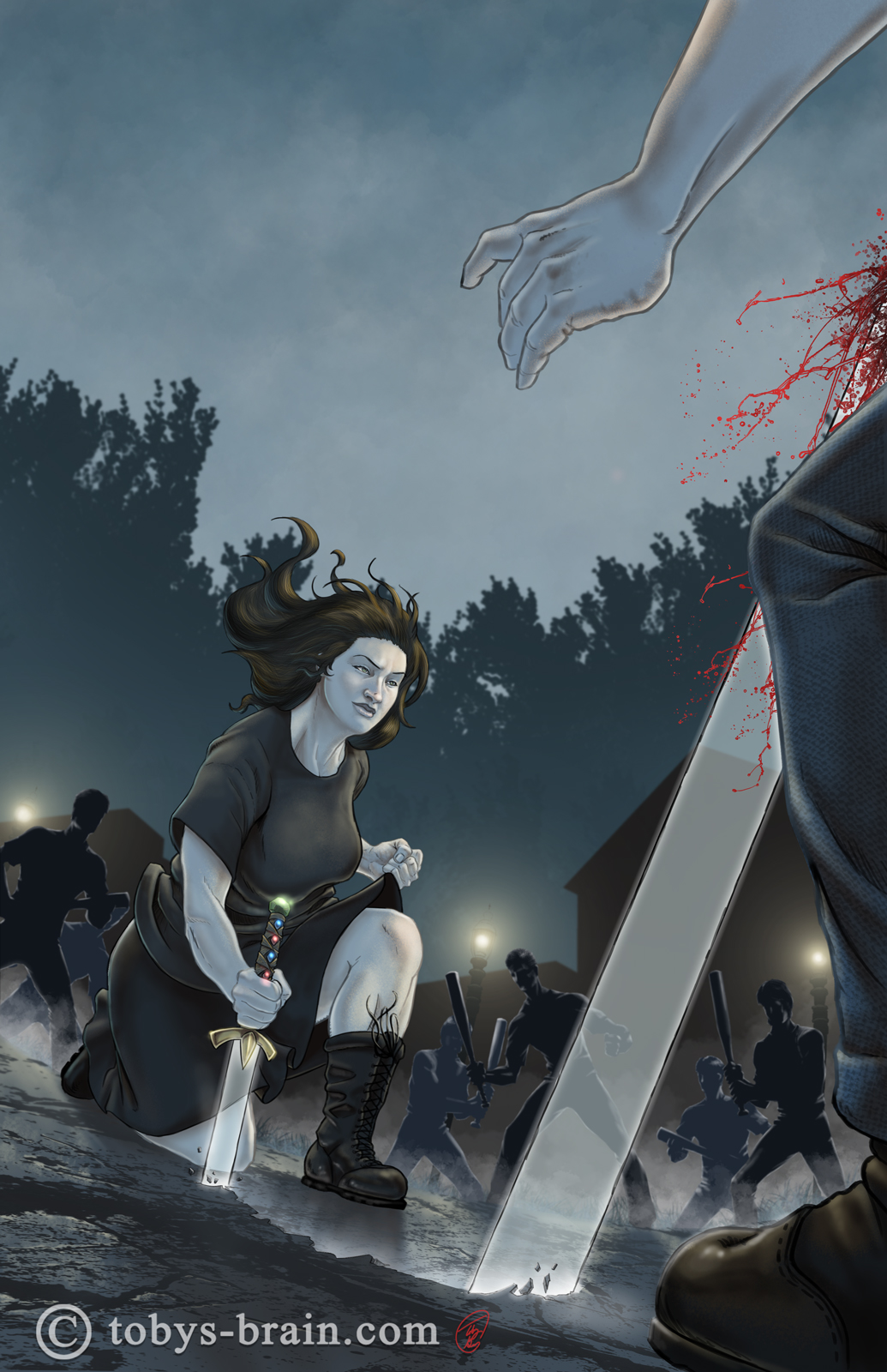 This scen from book one is a painful one. Thea grabs a cursed bat, which promptly turns into metal splinters that flow into her body. This one was the quickest turn around, but I could have kept noodling away at it for a while. More splinters, more blood, more pain…I kept the background intentionally very vague to highlight the action (the scene takes place in a barn, so I went with some warm, wood type tones for the background). I used my wife’s hand hold a bat for reference for this (I refrained from insisting that she stab herself with needles and sharp things though).