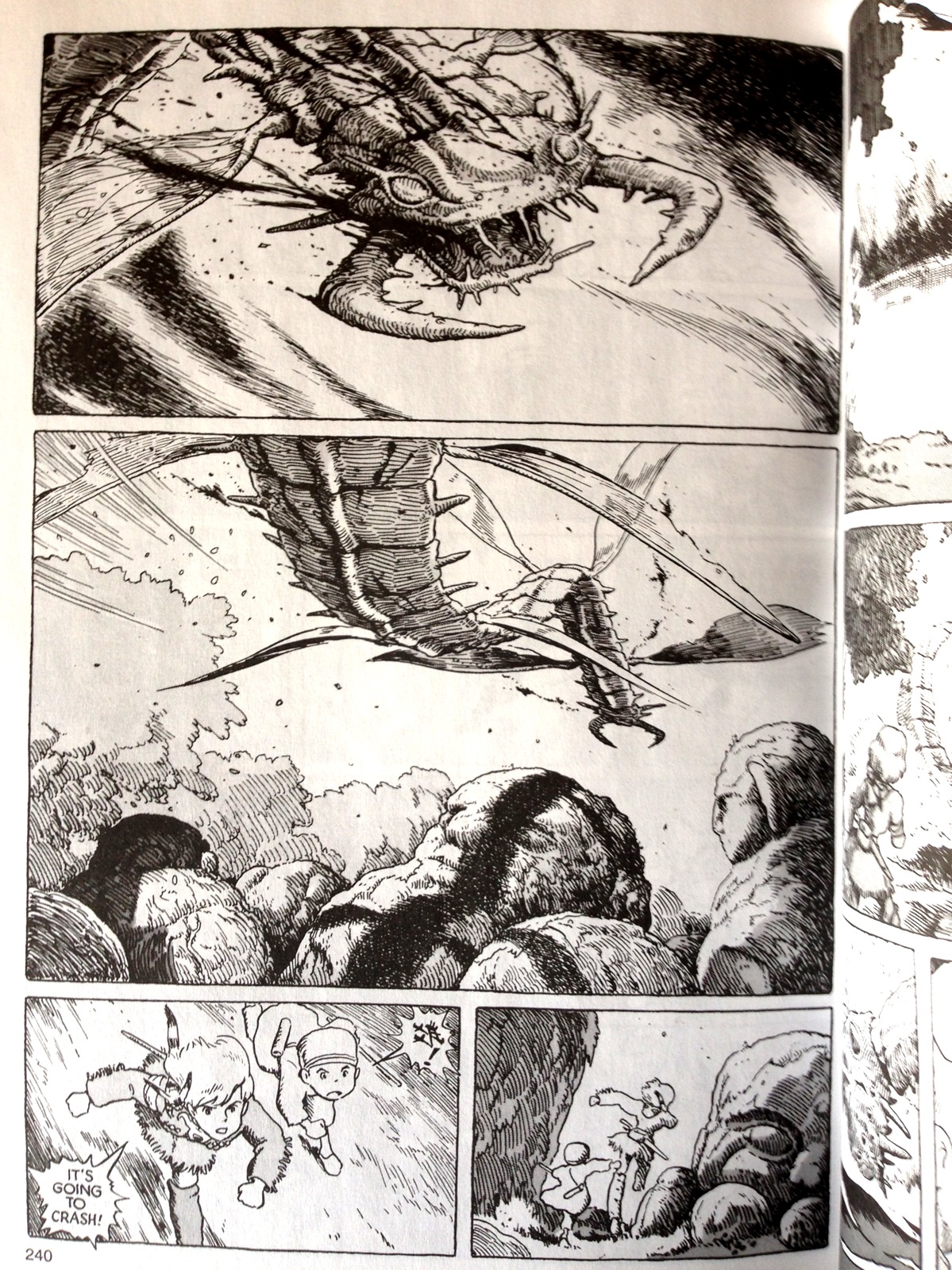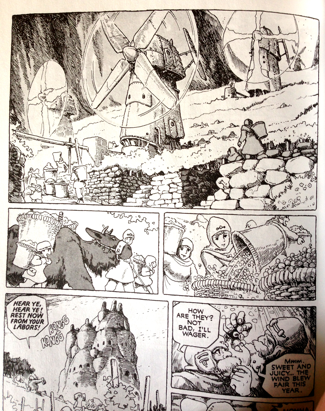 It’s not just the art that inspires me, though. The story is fantastic as well. It’s epic, it covers a lot of ground both geographically and character development-wise, which is a hallmark of Miyazaki and Studio Ghibli (the animation house that is responsible for so many amazing movies). It’s a post-apocalyptic tale (which I seem to have a soft spot for for some reason), humans have destroyed their environment and the earth is covered in an ever expanding, mysterious fungal forest that is releasing a poisonous miasma and is slowly reclaiming the planet. The main character, Nausicaa, is a bit of a sympathetic environmentalist who seeks to understand the forest and the ginormous insects that thrive there, all the while butting heads with the majority of humans who want to fight and destroy it. Plus there’s politics and war going on.