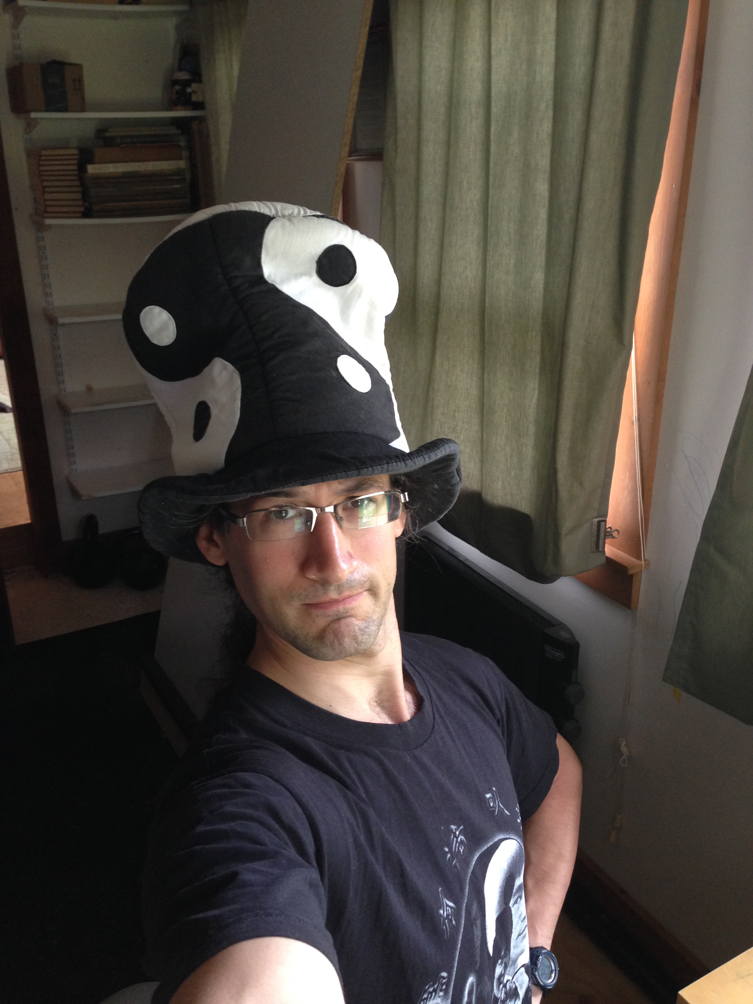 I bought this hat my senior year of college, partly because it’s fun and cool, but also as a stab at some self therapy. You see, I’ve always struggled with self esteem/self worth. It’s a bit better now that I’m older, but I still deal with it. Back in 1999, I was pretty depressed. I was burnt out from school, I didn’t know what I wanted to do with my life, I didn’t think I’d ever accomplish anything, my dreams were vague, I thought everyone hated me…it was a pretty dark time. I walked into a mall store (Spencer’s Gifts, I think. Do those still exist?) one day and locked eyes with this hat (just pretend the hat has eyes for now) and decided I had to have it. It was crazy and fun and made me laugh when I really needed to. I was a bit more outwardly expressive and goofy back then, especially around friends like Jorj. Part of my reasoning for wanting the hat, which I knew was going to draw attention and comments, was that I always felt people were talking about me behind my back, but now I’d at least know what they were likely talking about. Not exactly sound reasoning overall, but there is a bit of Toby Logic to it.