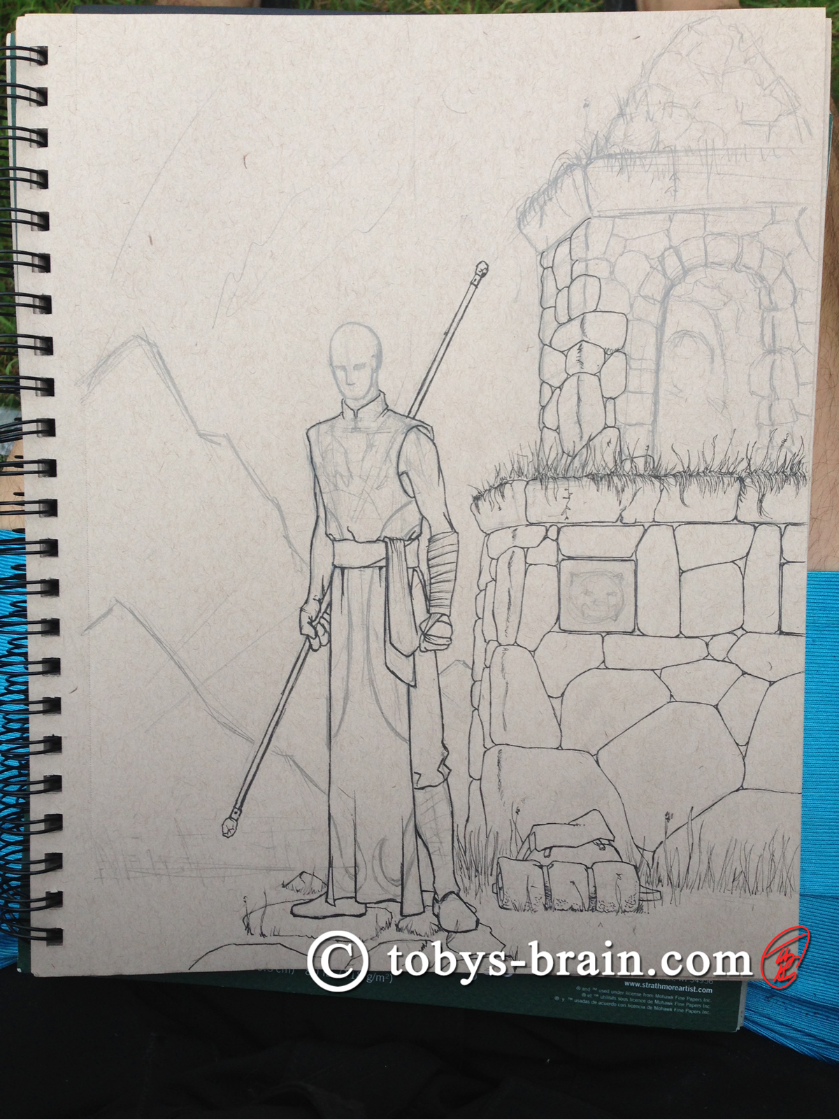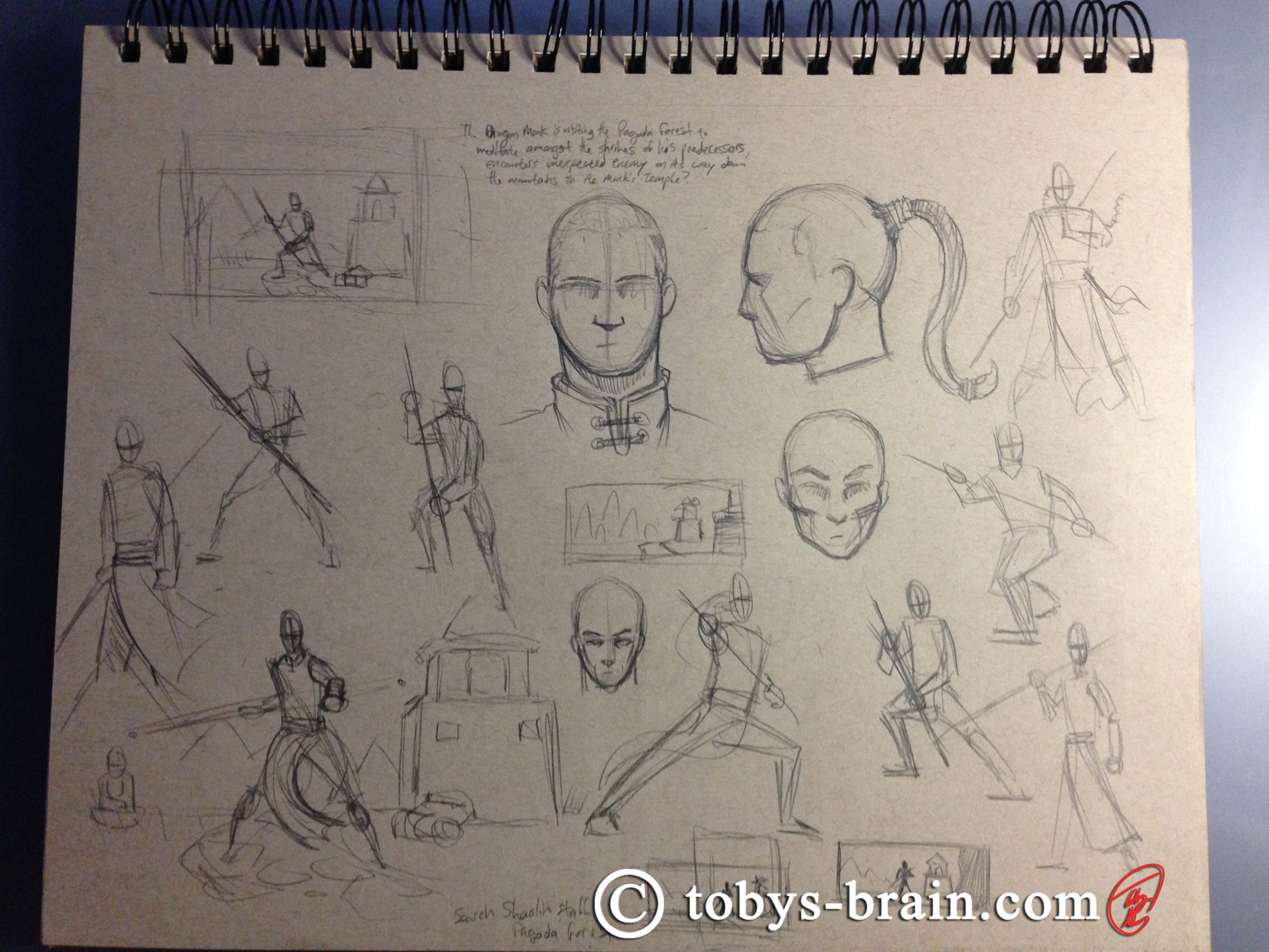My brain told me the Dragon Monk was on a pilgrimage to the Pagoda Forest (there’s a real one at the Shaolin Temple, which is part of the recipe in my subconscious that produced this idea) to meditate amongst the tombs of his temple’s ancestors. As he nears his destination, high up in the mountains (the Pagoda Forest was built on the highest mountain so the ancestors could watch over the world…we’re talking about my imaginary Pagoda Forest, not the real one), he encounters an adversary that should not be there, making it’s way towards the temple. I had drawn this Dragon Monk character a decade or so ago, squaring off with an attacker, before I knew much about him other than what his robe looked like.