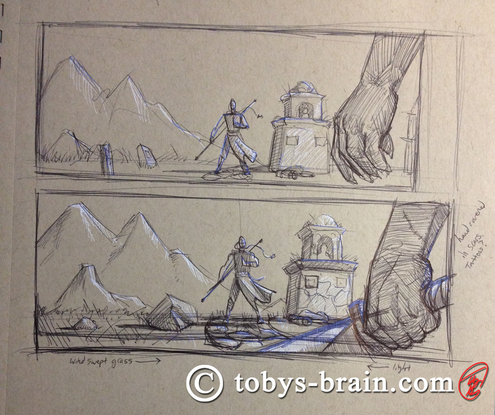 I’m still playing around with the composition. Overall I like the direction I’m headed, but I need to avoid having the figure smack dab in the middle. I’m seeing a lot of atmosphere and depth of field in my head for this piece, something I feel like I struggle to capture in my drawings. This will be a good exercise to get better at it.