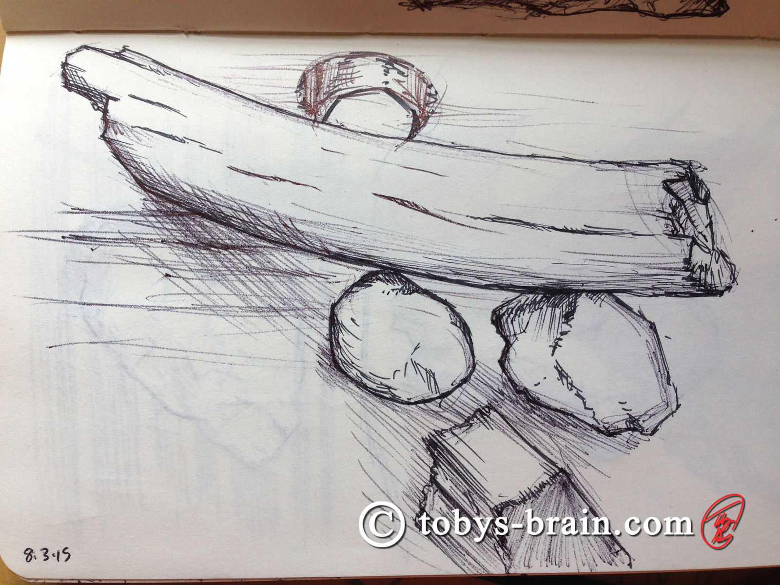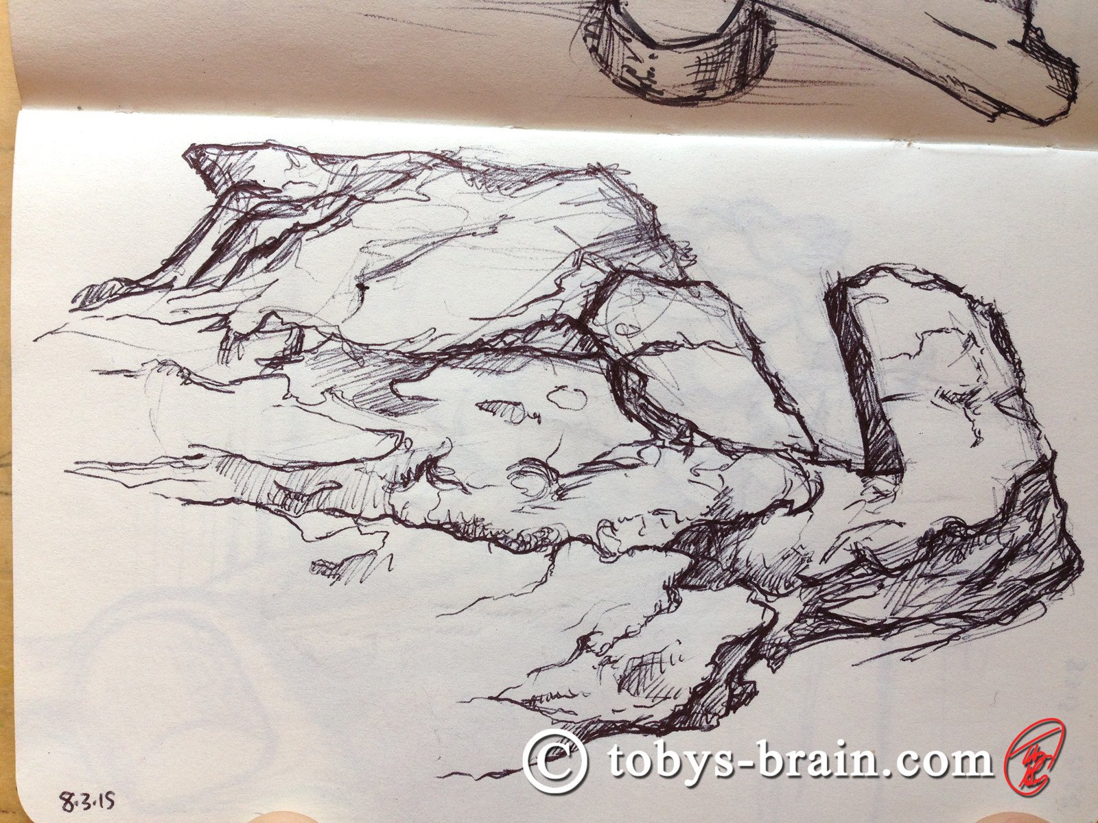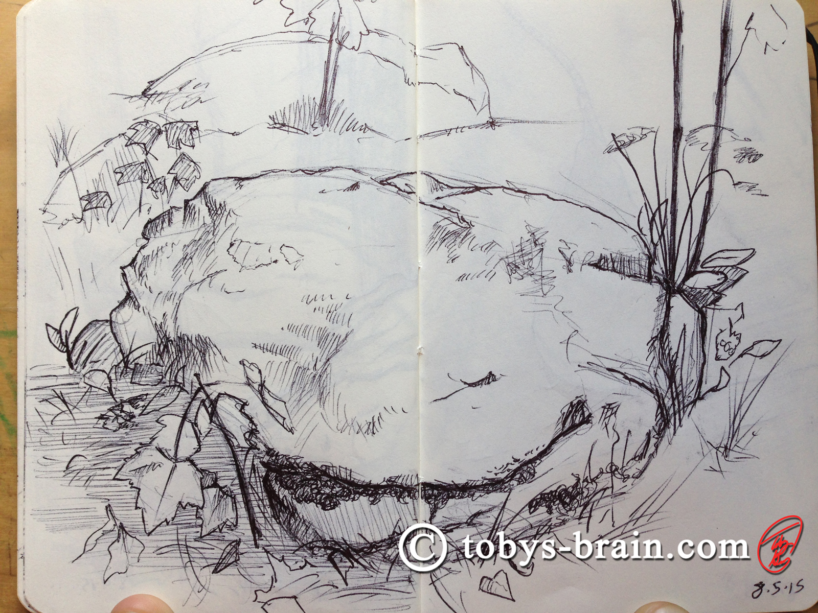 There are a plethora of great boulders to draw at camp. This one sits just outside the S.T.E.M area. I screwed up the proportions a bit. This was my first attempt at sketching across both pages of the moleskin. It is bound in such a way to make this feasible, and it really opens up some sketching possibilities.