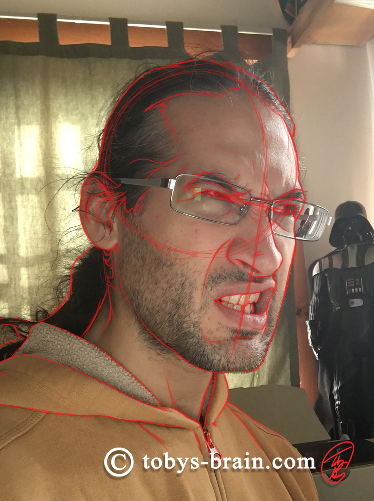 I create a new layer and start roughing in reference lines and shapes similar to how one might sketch a head without the reference material. I’m trying to get a better sense of the specific shapes and proportions of my head, so I don’t need to rely on the photos. I use red just because it shows up better.