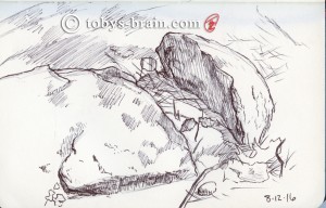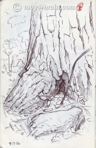 This is the last drawing I did at Camp Bell this summer. The leaders had some downtime at our site in the middle of the day, so I picked out this cool scene of a split rock and a micro valley inside. I like scenes that have a flexible sense of scale to them. I could easily imagine these elements being ginormous and me standing in that valley. That might be a fun, future drawing project…similar scenes from that perspective.