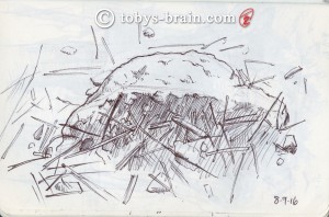 This was a rushed sketch of a rock poking up through the earth in the black smithing program area. Not long after starting this sketch, one of our younger scouts began having a difficult time with the activity and his mood was starting to spiral downwards. I stopped drawing and stepped in to help him eventually get back on track.
