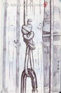 I got to spend a little bit more time on this sketch of some thin rope and a carabiner in the camp’s climbing barn. I love knots and all their different functions. Drawing knots can be challenging to wrap your head around without reference, so this was good practice. I liked the juxtaposition of the different materials in this scene as well: the wooden post, the rope, and the metal carabiner.