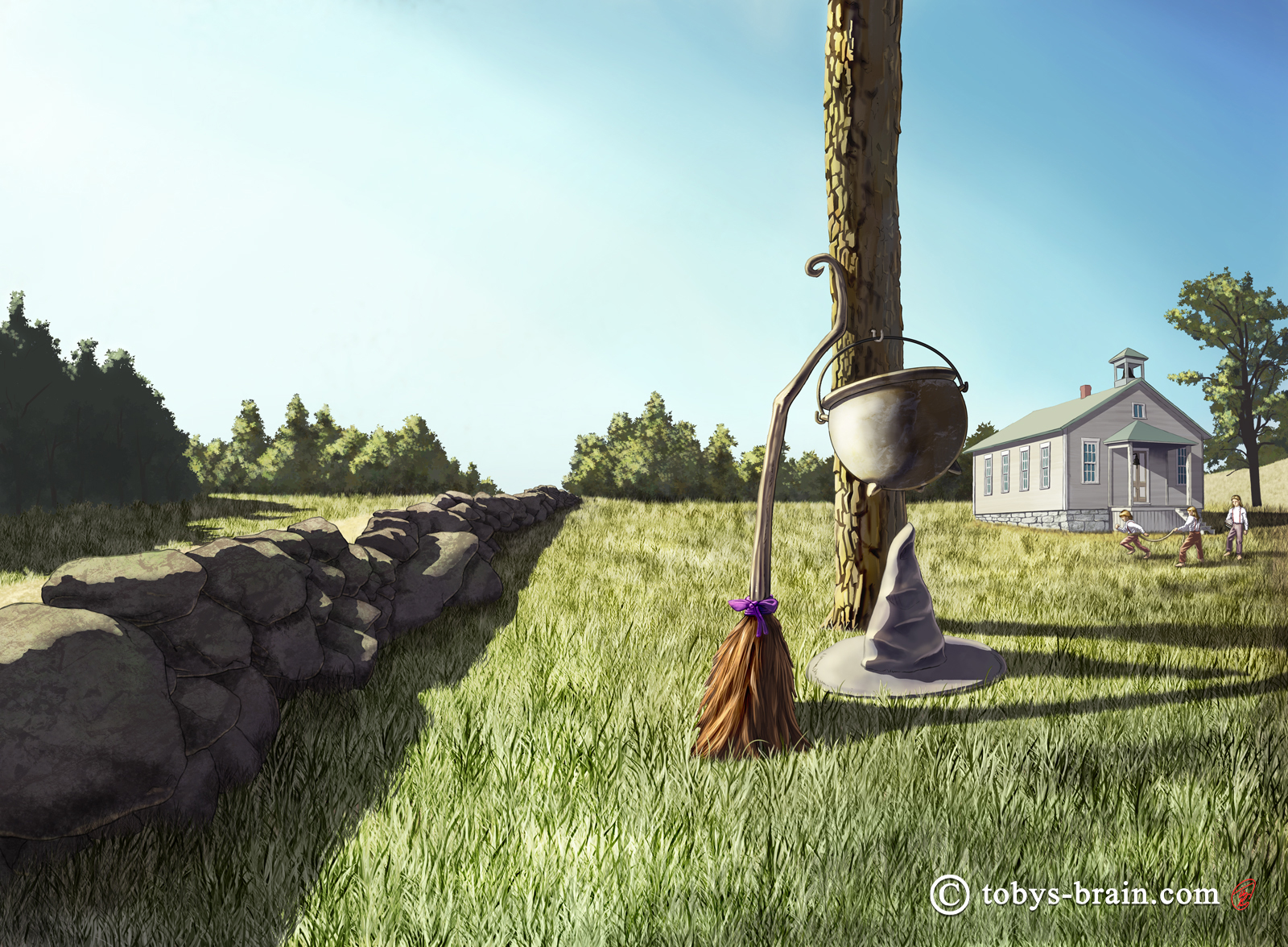 Secondly, I tried out a new approach after watching some comic book coloring tutorials. I came up with a composite of photos to set the scene, then roughed out the cover. Once that was approved, I worked up a detailed drawing, focusing on the important elements of this composition: the stone wall, the tree and Thea’s “gear”, the 3 boys, and the school house. Pretty much everything else I left to be painted without the linework. The next step was a process I’ve sort of tinkered with before, but after the comic book coloring tutorials, I’m really starting to explore the possibilities of it: flatting. This is where I’ll create a selection of an object (under the linework, if there is any) and fill it with a solid chunk of it’s local color (for example, green for the trees). Once the whole image is “flatted”, I copy it and work on the copy. This allows me to go back to that flats layer and make precise selections quickly using those chunks of color. On the copy, I’ll add slight color variations, since that’s the way things look in the real world. Normally I’d next add a Multiply layer and paint in shadows with a neutral bluish color, but this time I tried something a little different. I made use of one of Photoshop’s many non-destructive adjustment layer features: solid color. This adds a customized color layer that always extends to the borders (useful if I were to change the canvas size midway), as well as provides a layer mask. What this allows me to do is more carefully paint in where I want shadows on the layer mask, but very easily remove them if I screw up or want to change something. It also keeps the shadow color consistent in case I forget to save a color swatch of my shadow color. It proved to be a pretty good way to work, especially with the selections I could make from my flats layer. I did the same thing with a highlight color.