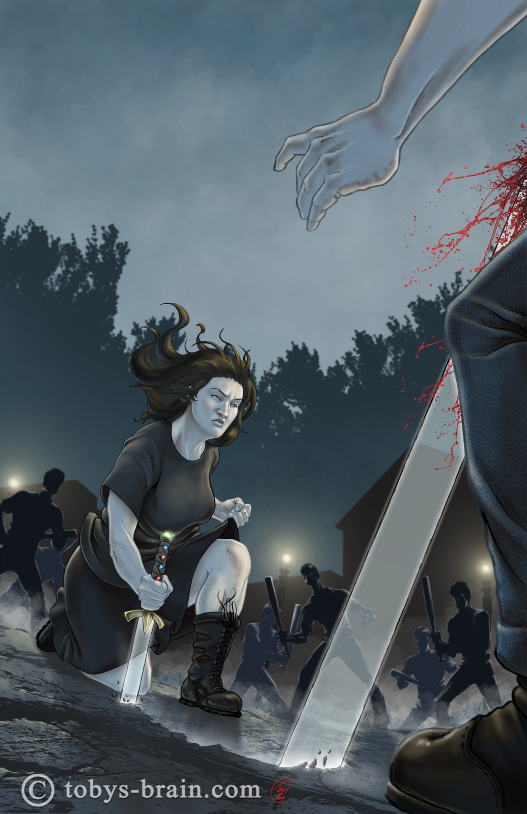 This scen from book one is a painful one. Thea grabs a cursed bat, which promptly turns into metal splinters that flow into her body. This one was the quickest turn around, but I could have kept noodling away at it for a while. More splinters, more blood, more pain…I kept the background intentionally very vague to highlight the action (the scene takes place in a barn, so I went with some warm, wood type tones for the background). I used my wife’s hand hold a bat for reference for this (I refrained from insisting that she stab herself with needles and sharp things though).