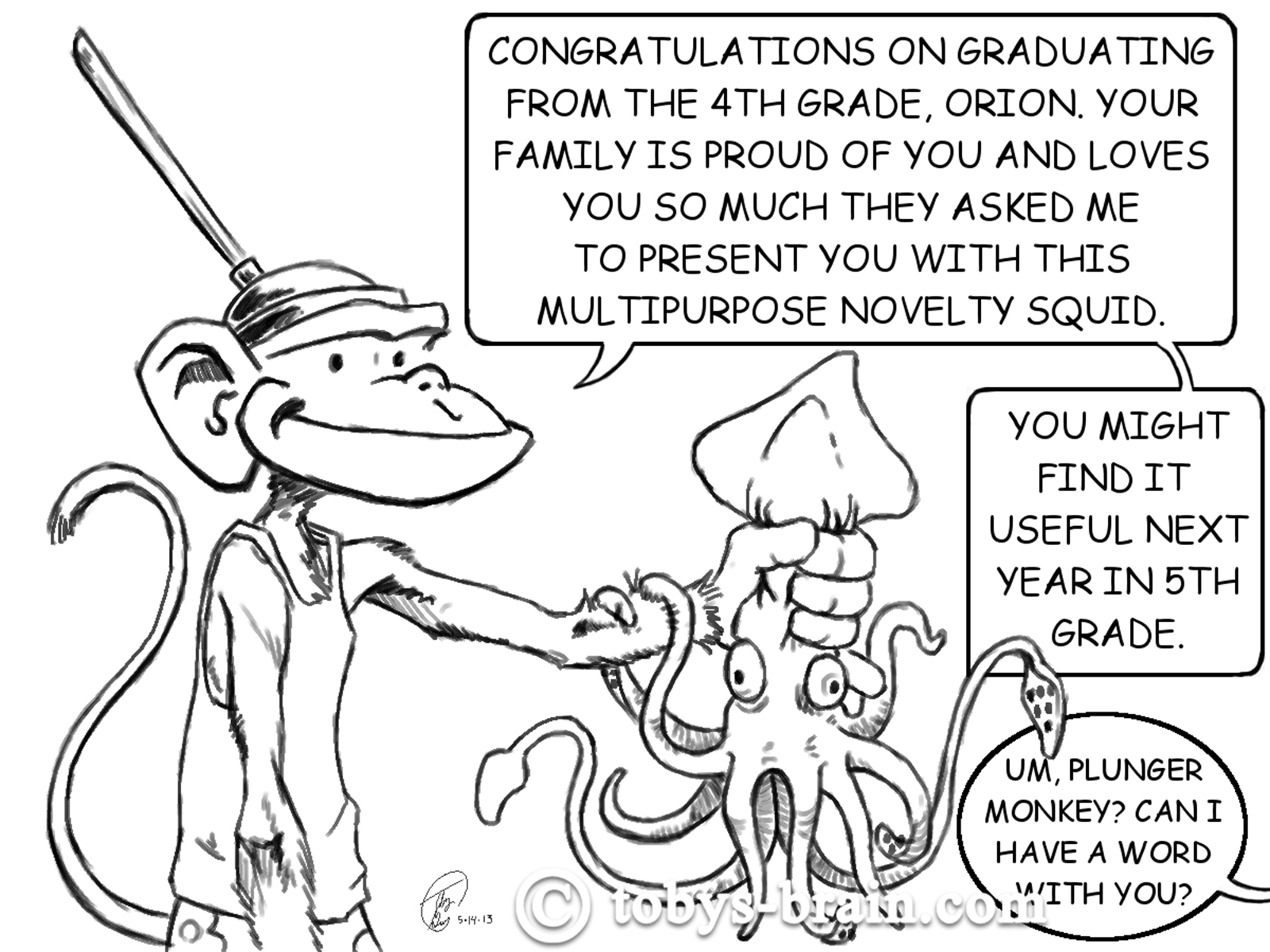 Two years later, my middle son wrapped up his elementary school days, so it was time for another personalized PMD illustration. My style and skill with the tablet was obviously much more refined, and Plunger Monkey is starting to look more like himself. I still wasn’t certain how he would communicate, but I was not far from coming up with the notion of his using signs. Notice that the word balloons lack “tails” to indicate that it’s him talking (it’s actually me, but off camera).