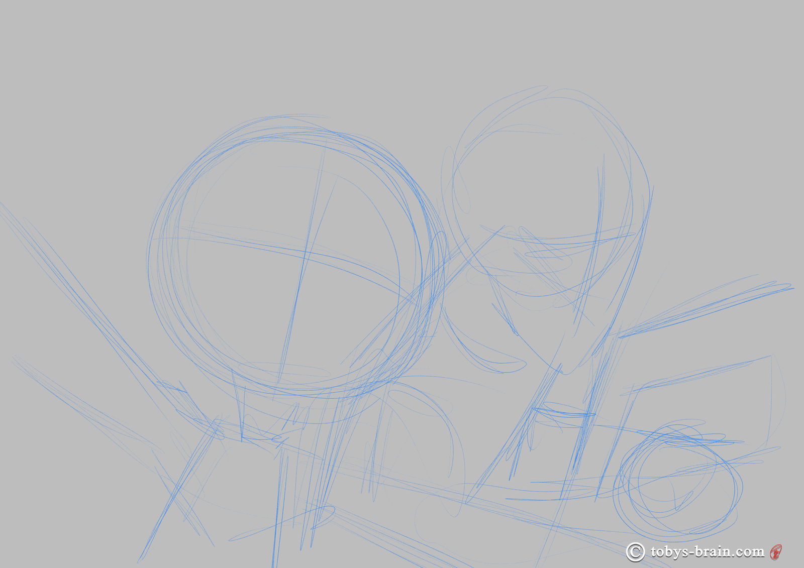 After the rough sketch and messing around with the 3D model, I decided I needed a good reference photo for myself. It took a bit to rig up my camera in the right position, but I was able to refer to that 3D model to get it worked out. I dropped it into the original rough sketch so you can see how off I was. I could have traced the photo and rendered right on top of it, it would have been faster and more accurate, but I doubt I will ever be able to bring myself to do that (it’s cheating!) outside of specific anatomy drawing exercises.