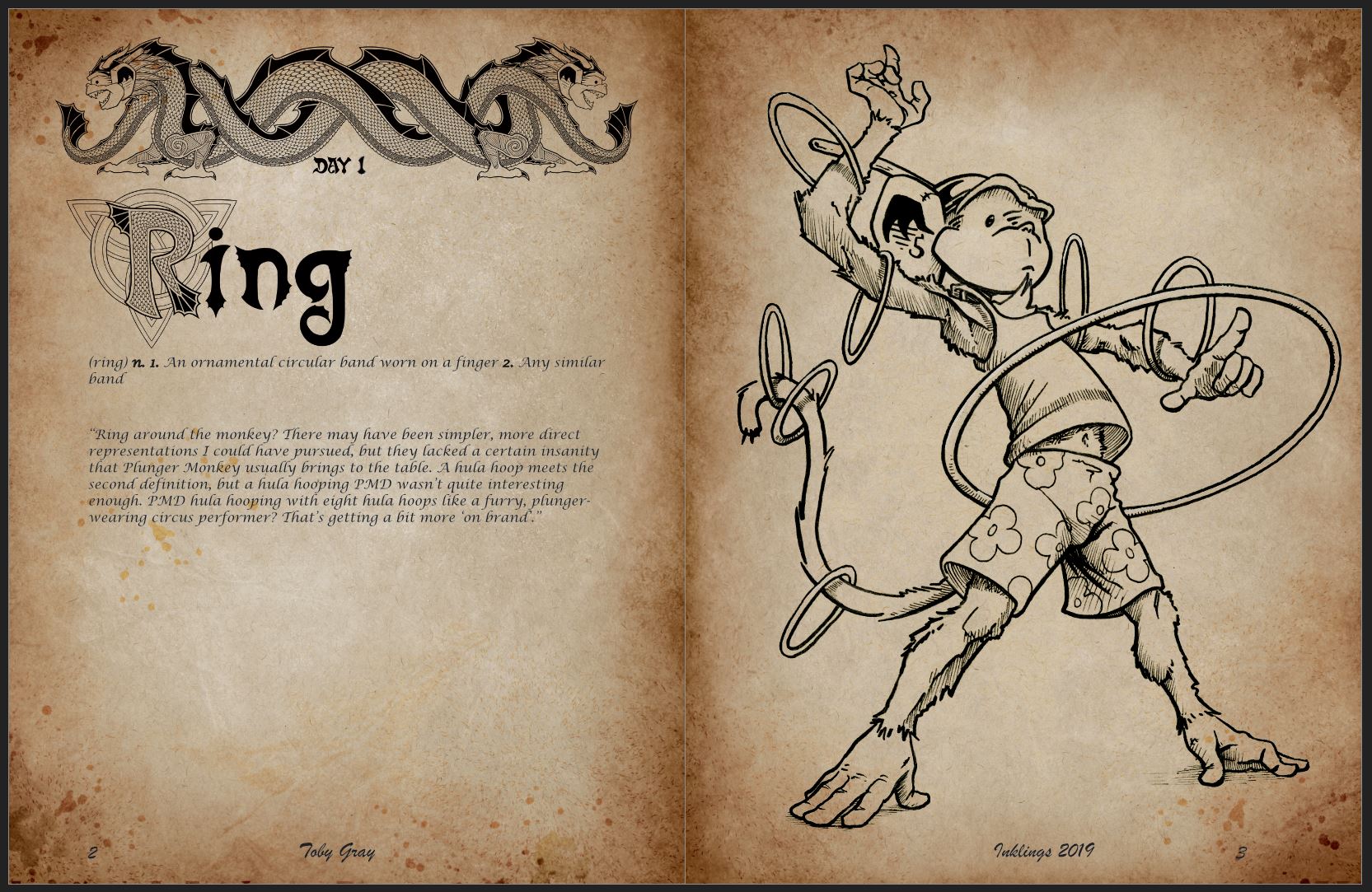 The bulk of 2022, though, I spent working on Inklings, an artbook collecting 3 years’ worth of my Inktober illustrations, plus some extra bells and whistles. I created custom paper textures, learned how to use Affinity Publisher to assemble a book, and designed 3 themed, pretty complicated and intricate fonts, along with some related header images. It was a ton of work, but very fun. I came very close to completing the whole project in one year, but got sidetracked by other things. It’s been close to two months since I’ve worked on it, I think (if not a little longer), so I can hardly remember where I left off. I know I didn’t have much left, maybe one “goodbye” illustration for the last page, and then distributing some other smaller doodles on all the pages. Once I put the finishing touches on everything, then I have to do the stuff I dislike: actually getting it published and printed. I have my own publishing imprint, and purchase my own ISBNs (which is another process I have to remember how to do), but the big hurdle will be the actual printing. It’s a 300-ish page book of full color images, so it’s going to get expensive. I don’t know if I can do it print-on-demand. I’ve contemplated going the Kickstarter route, and even have some ideas for the special extras for the different tiers of investment…but that’s going to be a lot of work, and will require that I learn how to do something completely foreign and new. Ugh. In the meantime, here’s a preview of some of the pages and the custom fonts, along with the themed headers and the cover.