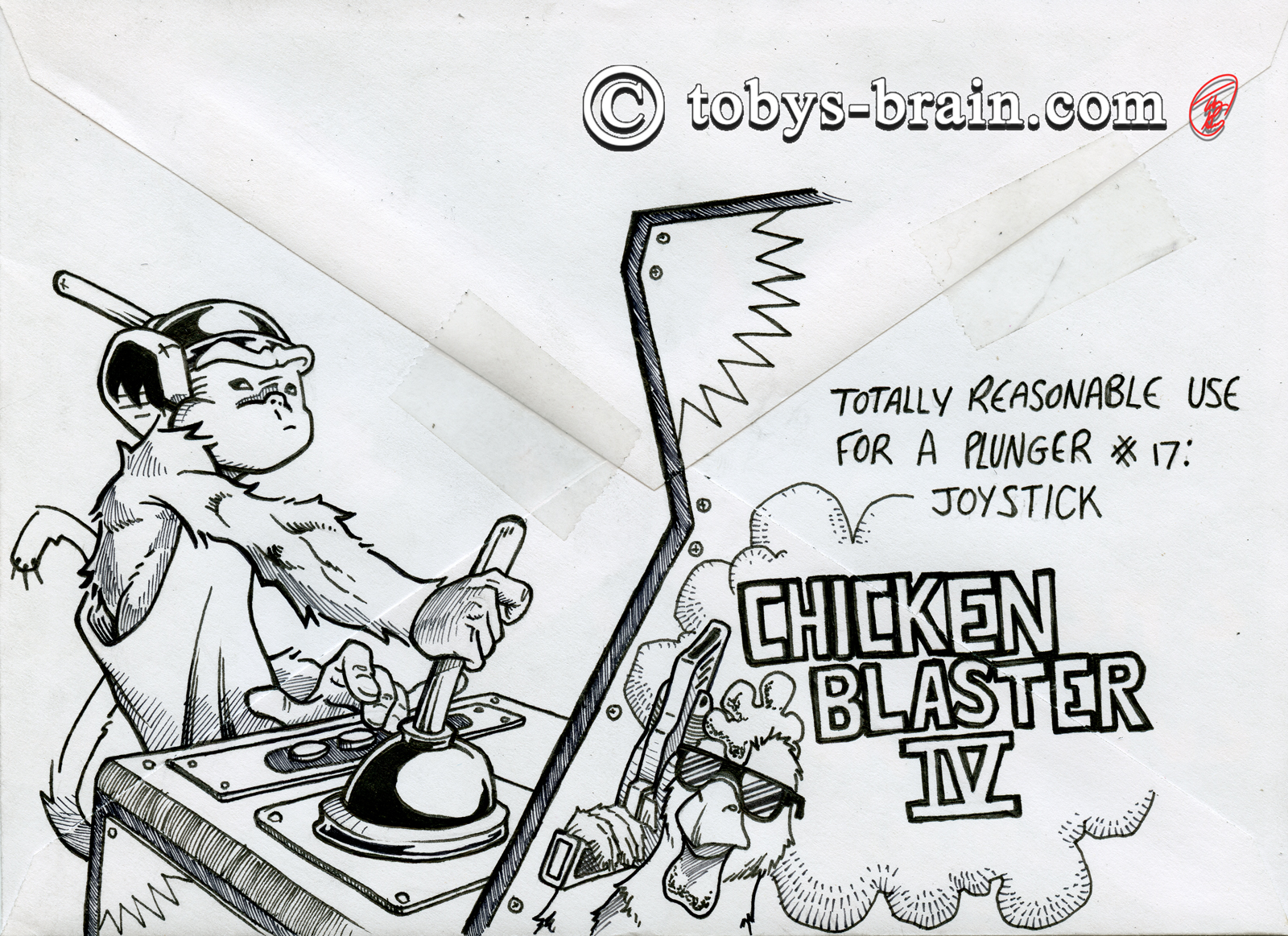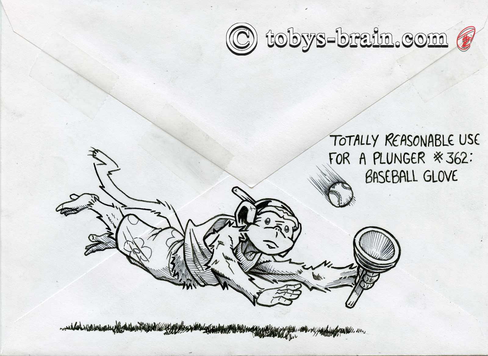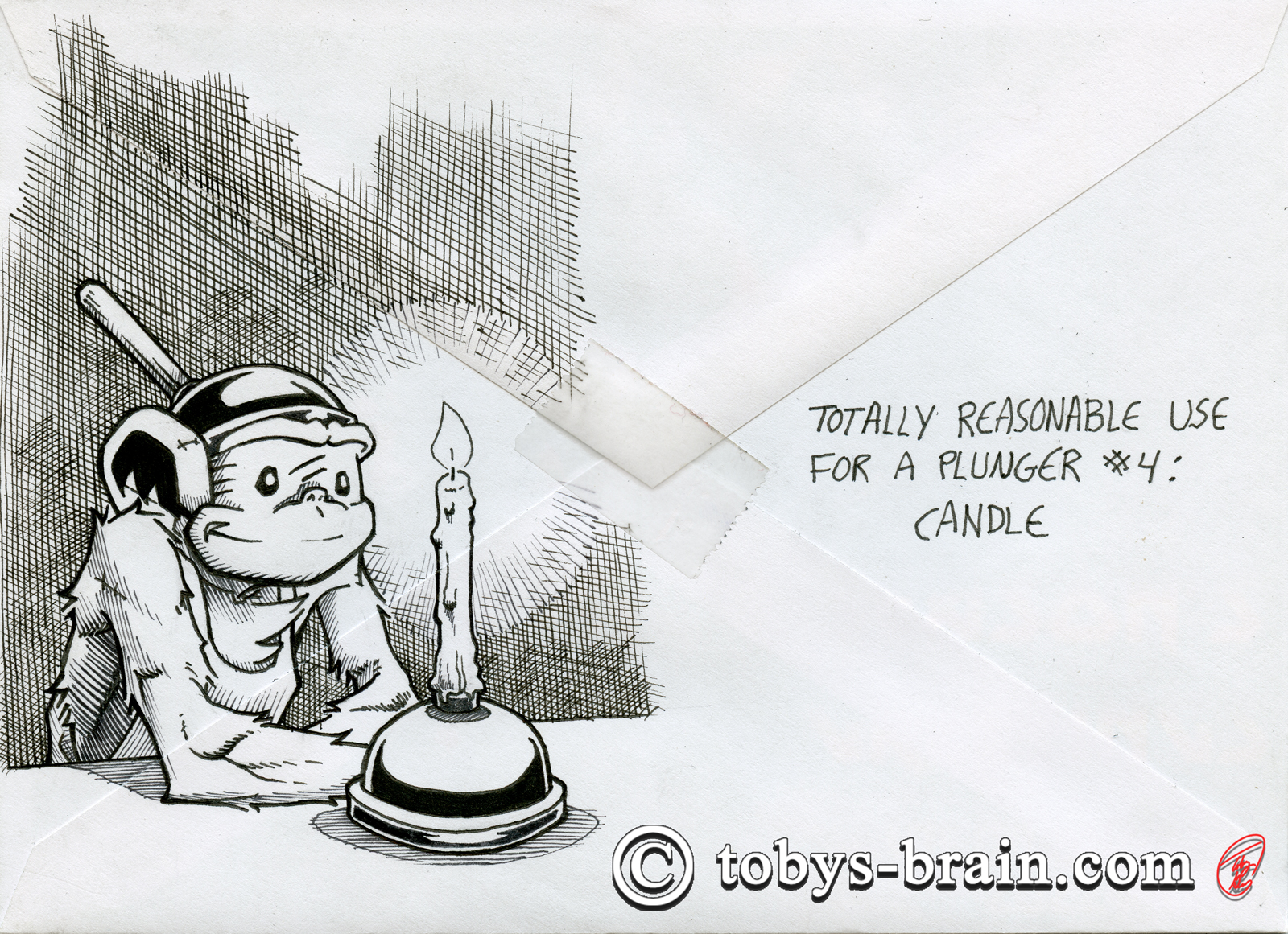 When I look back over the years of envelope art, I’ve noticed a trend: I’m putting more and more thought and care into them. I have no idea what condition they even arrive in, if anyone hangs onto them once they’re opened, or if they are destroyed by that point. However, I enjoy doing it, and it has inspired what I think will be a really fun book: Totally Reasonable Uses for a Plunger. I started a list of ideas a few years ago and I’m keeping track of all the random numbers I assign them. This year I thought of some other elements that will go into the eventual book, so I began a bit of a time saving workflow for when I eventually put the book together. All of these illustrations will serve essentially as rough drafts for the final images. It’s funny, I get a little stressed each year about coming up with clever ideas and how best to illustrate them, but it always seems to work out and I have a lot of fun. One of these days I’ll learn to trust my Brain.