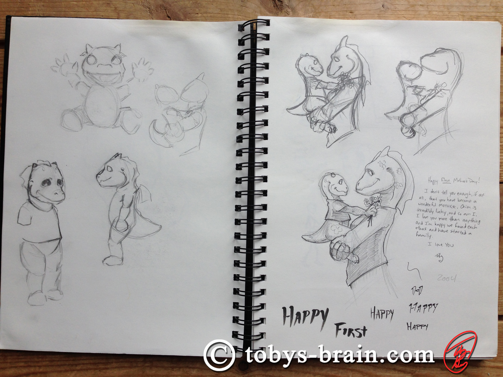 This is the first, hand drawn, Mother’s Day card I made for my wife after the birth of our first son. My wife loves dragons, so I started this little tradition of drawing all our kids as cartoony dragons. This is the only card where someone other than the kids shows up (my wife in dragon form), other than our dog from 2013. This was pencil, watercolor, and colored pencil on water color paper.