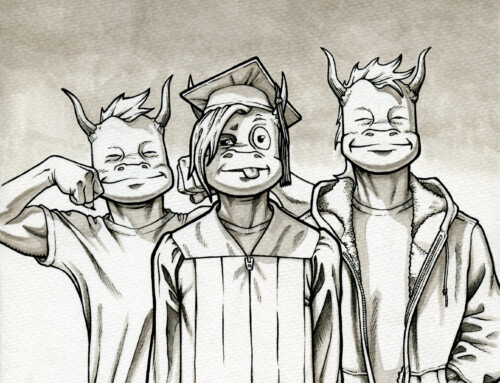 Finally, this year’s traditional dragon kid Mother’s Day card. The boys are posing in front of our youngest’s favorite trail sign, which looks very much like a face. He’s loved this sign since he was very little and requests a picture with it almost every time we hike past it (which is often, as the trail head is essentially “right around the corner” from home). All three boys love the outdoors and hiking and have been really itching to get out on the trails this year (once ski season wound down). I’m actually pretty happy with this one, I think I captured the personalities and looks of our kids, as well as this favorite spot.