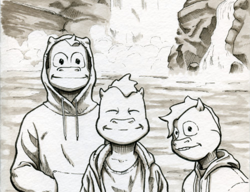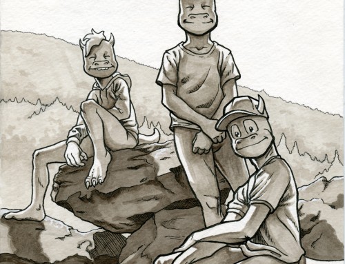 Another year, another hand drawn Mother’s Day card for my amazing wife! I personally enjoy seeing the progression in my art skills as I inevitably look back at the last few years’ worth of cards to plan the new one. I’m also noticing that I work with a lot more confidence, and a bit more speed as a result. This year, the dragon boys have aged and are engaged in one of their favorite hike-based activities: building rock cairns.