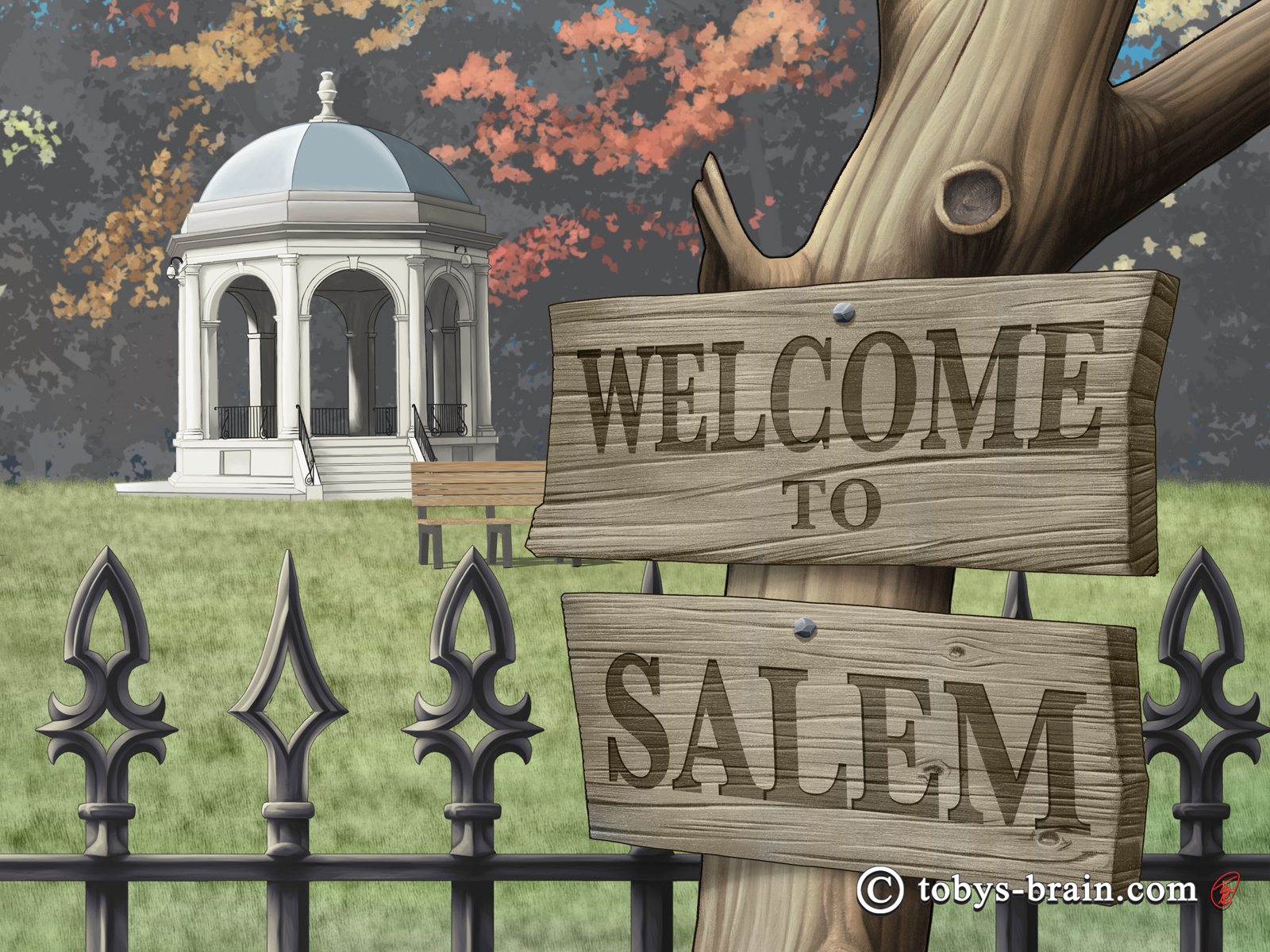 Author L.S. Gagnon wanted to completely revamp the covers of her latest books in the Warlock Series. I had done the first book a few years ago, but not the follow ups. This is a completely different direction from the original, trying to highlight one of the most important aspects of her stories, which is that they take place in Salem. After much brainstorming, we settled on this connected series of covers and I’m really happy with that choice. The park and the gazebo are from a park in Salem where some key aspects of the story take place. I recreated the fence based on the actual fence and turned it into a tiling/repeating texture element in Clip Studio (you know, in case I ever need to use it again). The focus of the front cover for this first book (on the right hand side) is the “Welcome to Salem” sign, which is a revamp of the sign that appears on the final book of the Witch Series that the author really liked (which I also illustrated). I stumbled into a new work flow while working on this cover that I’ve started to adapt to some of my other work, which is always exciting and fun.