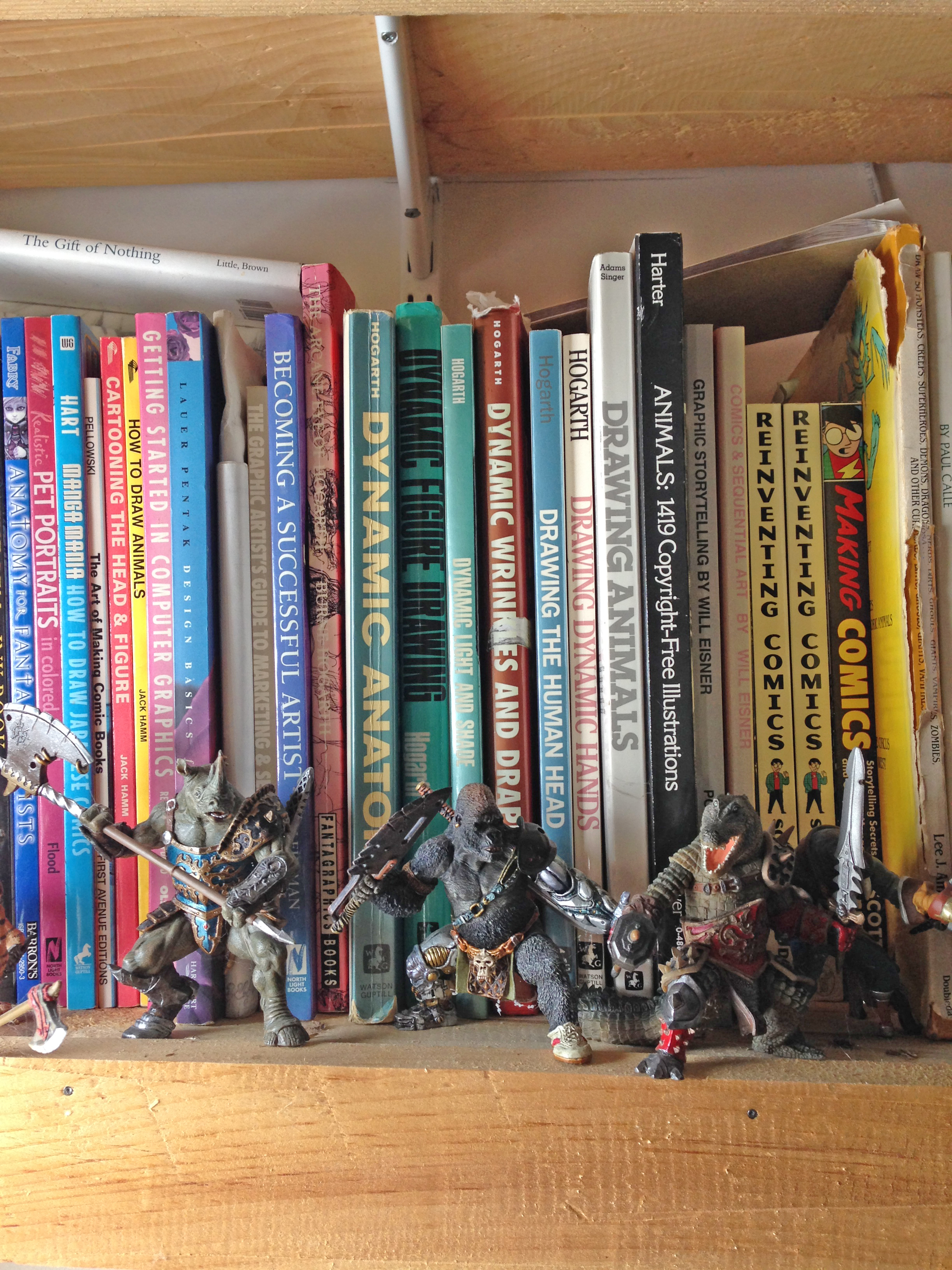 If you know me, you know I love books (and comic books/graphic novels). If you’ve been in my studio (or you’ve seen the picture of me at my desk on the About Toby page), it’s readily apparent. I’m forever running out of shelf space and daydreaming ways to add more shelving (fortunately Lee and the kids are on board for this in the rest of the house, too). I’m not a terribly materialistic person (I think), I don’t