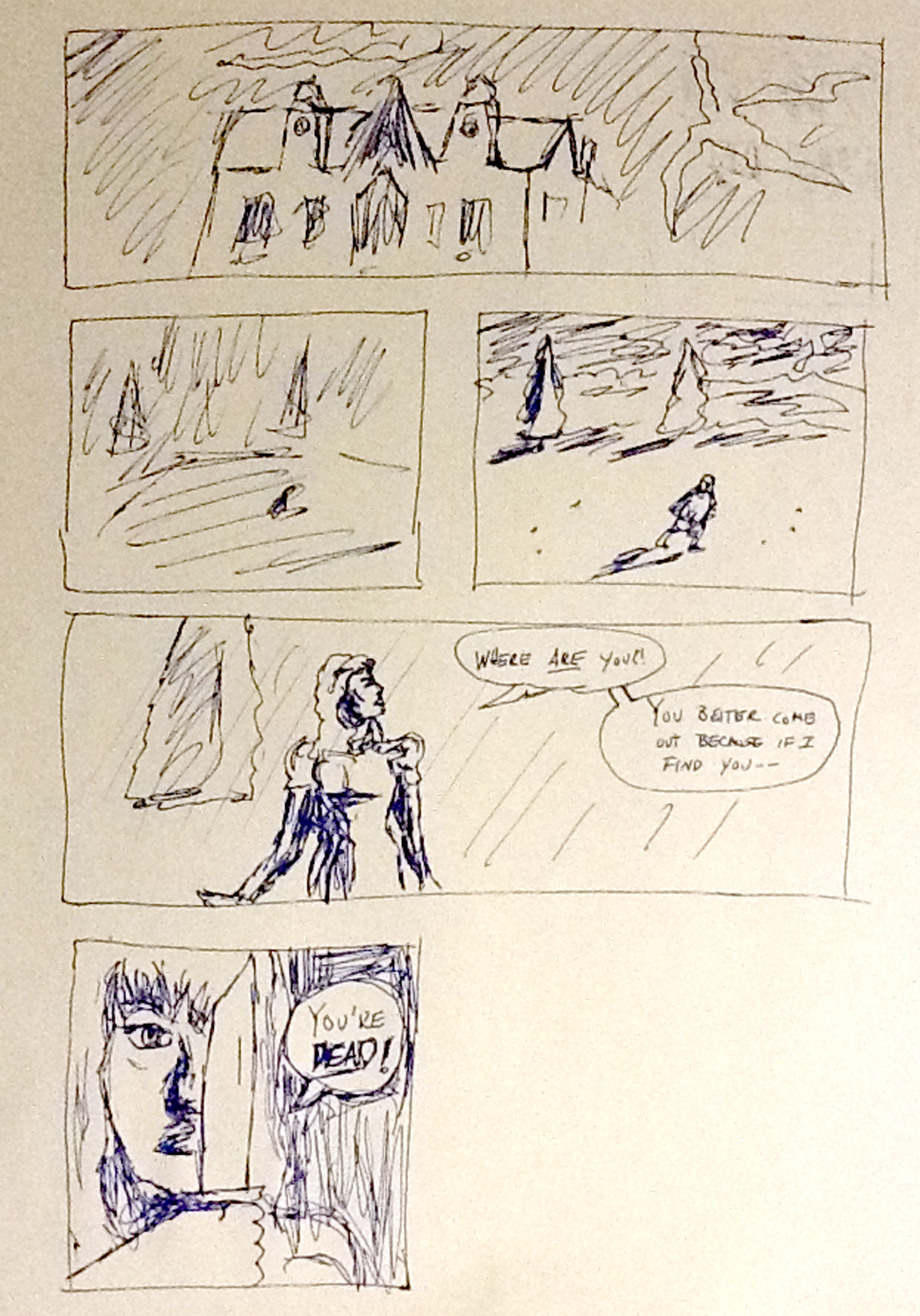 One of my best friends, Bill Gauthier, is an uber talented author (when he’s not engaged in his day job of teaching or tied up being a husband and father) who I’ve known for 15ish years (gasp). He gave an unofficial best man speech at my wedding (I had a very different kind of wedding), and I was the best man (and gave the Best Damn Best Man Speech in the History of Best Manliness) at his wedding. Early on in our friendship we attempted to collaborate on a comic book venture that fizzled out and went no where after a single issue, despite being enormous amounts of fun to work on. So when Bill asked me a few weeks ago if I’d be willing to draw single comic book page to possibly go along with the novel he is currently working on, I couldn’t say no. I promised I wouldn’t reveal any plot details when I posted this image (one of the perks of having a talented writer for a friend is that you get to read early versions of their work and provide feedback. I know exactly what this comic page is and why…but you’ll all have to wait until the book gets published. And I have no doubt that it will, it was fantastic), but one of the characters is a comic book writer/artist, and this is supposed to be an unfinished (hence there’s a blank space in the lower right hand corner) page he drew.