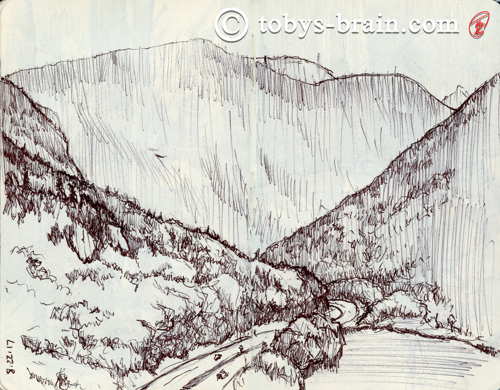 Fast forward back to the present. On August 19, 2017, my wife and I took the kids on a four day, three night camping trip in The White Mountains. The plan was to hike the Wildcat range, which we did, then spend the other days doing smaller hikes and visiting some tourist spots. On Tuesday the 22nd, on our way home, we stopped to hike Bald Peak across from Canon Mountain and to finally check out Artist’s Bluff, a spot we have driven by and talked about many times. Up on the bluff is where I finally, after 21 years, took out a sketch book and drew in The White Mountains.