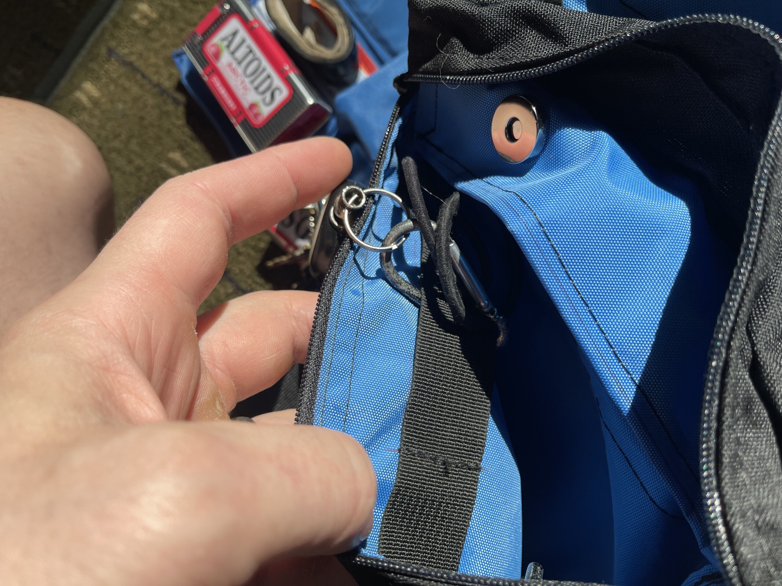 The two front pouches are lined with this high visibility electric blue that I like. It makes it easier to see items. Each pouch also has a line of webbing for hanging smaller items to make retrieval easier. This one usually holds my iPhone.