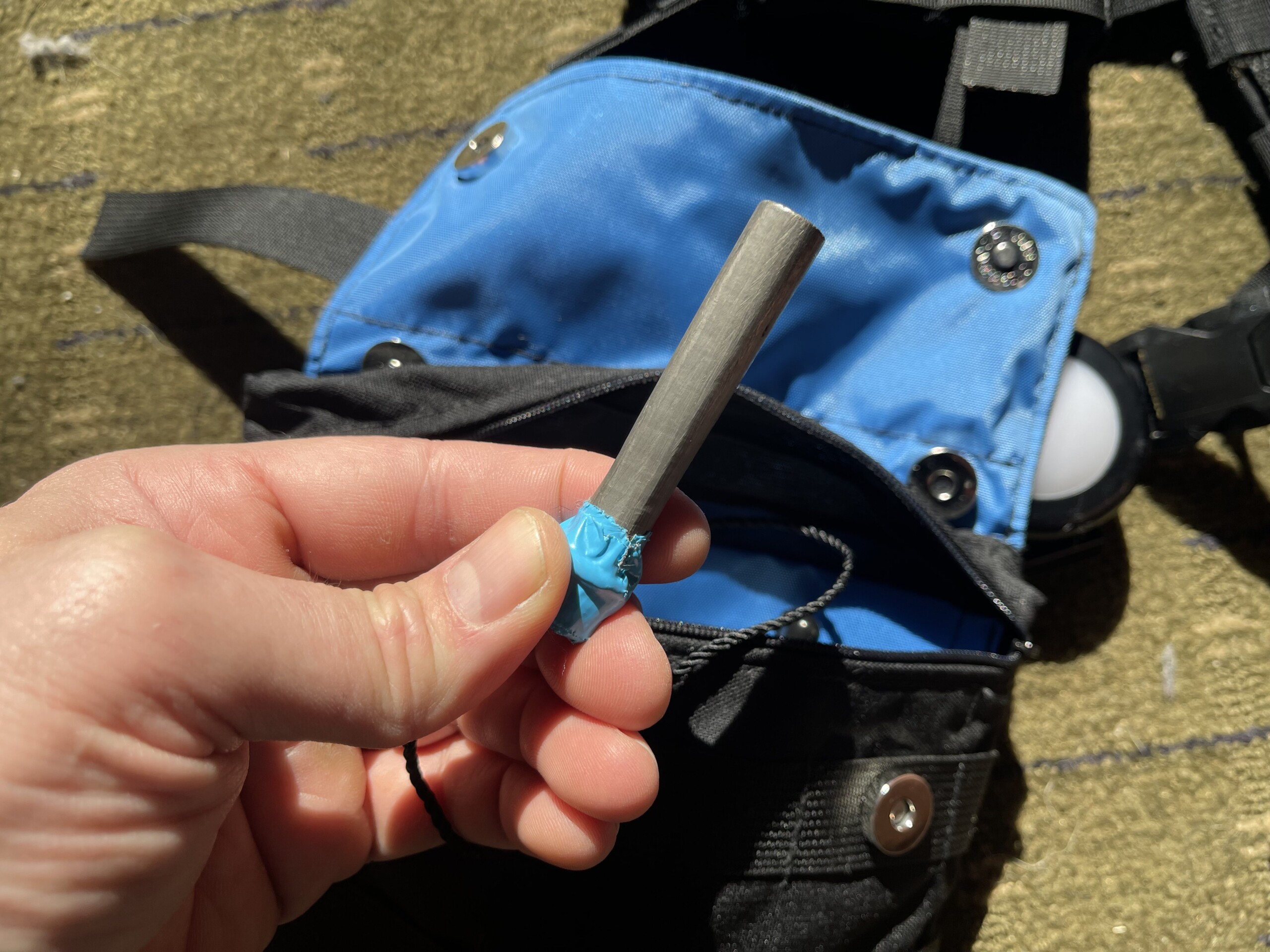 The upper pouch holds some redundant items: a second knife, a pocket bellows (telescoping metal straw for blowing embers into flame), a chunk of fatwood (great firestarter), and a rechargeable arc lighter on a tether.