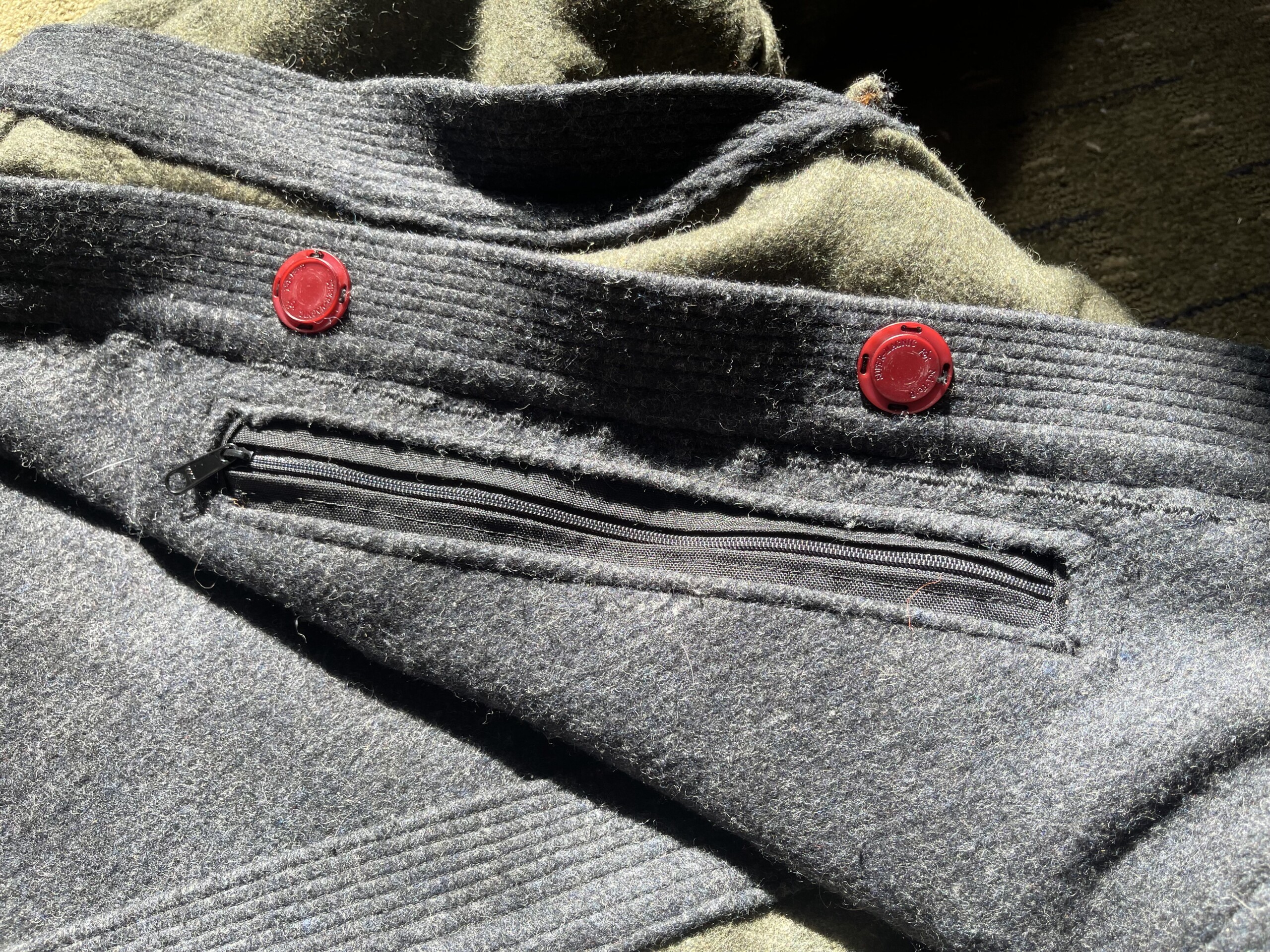 The first things I started sewing many years ago were long wool coats, one of which was styled after my karate gi. It was a simple, good coat and I experimented with a few features. I eventually rebuilt that coat, adding several layers of wool, some more features, and some more complicated designs. The “Beast Coat” was certainly warm, but some of the features didn’t work as intended, and it was too bulky and restricted my movement too much. I wanted the next coat to improve on that, so I changed the way I did a few things (like no more, or fewer, rolled seams with the already bulky wool blankets I work with. I experimented and found I could attach pieces by butting them together and using a zig-zag stitch. The problem was I had to run over the seam 3+ times to fill in the stitching enough to look good, which took a ton of time and miles of thread).