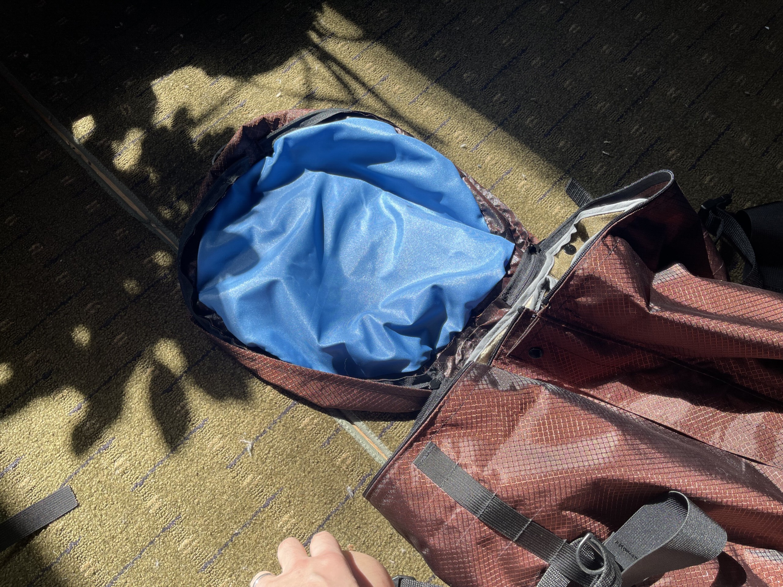 I added a giant pocket on the top and bottom for stuff I want quicker access to, or things I don’t want to empty out in order to use the bag as a half sleeping bag. There’s also a D ring to hook a strap to for one of several different carrying methods.