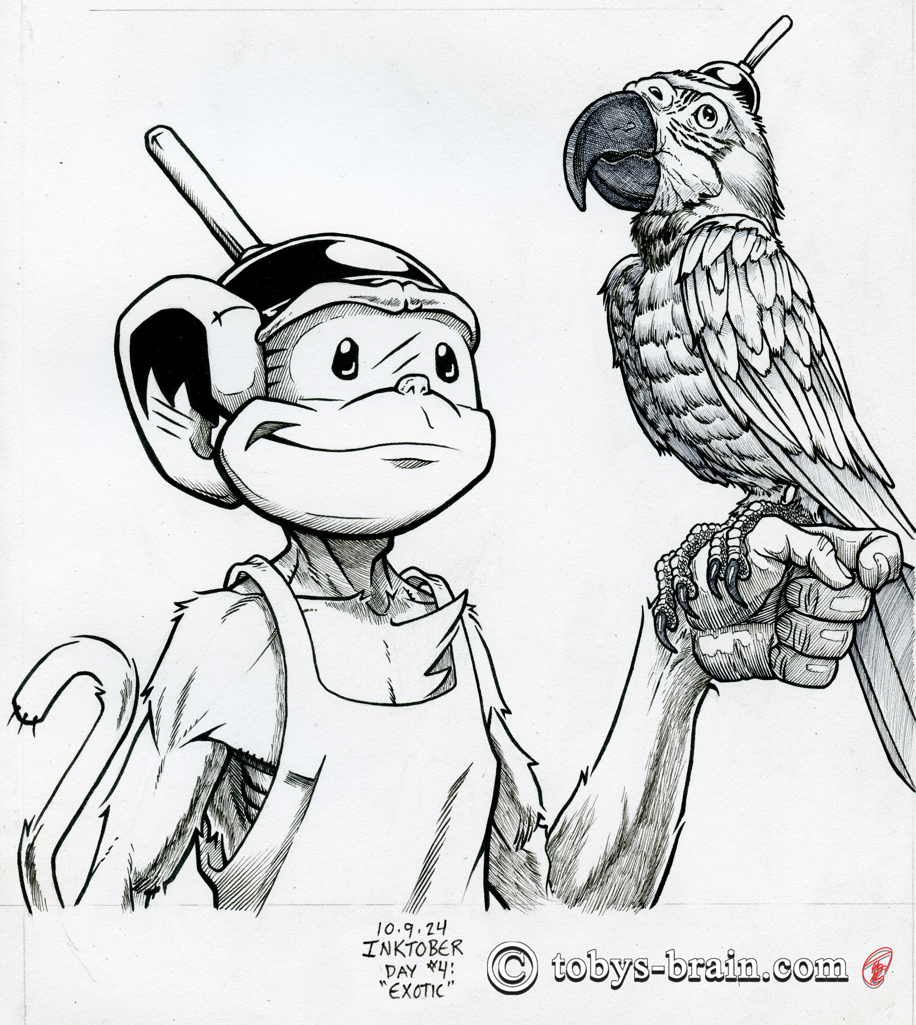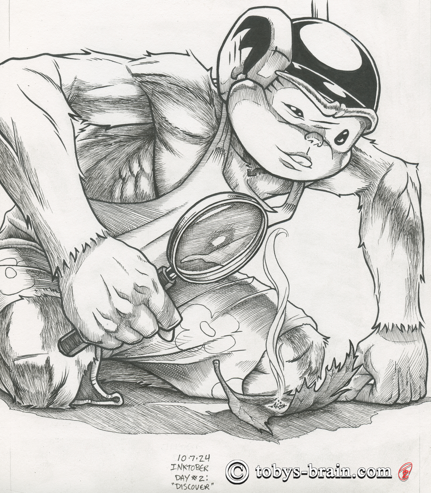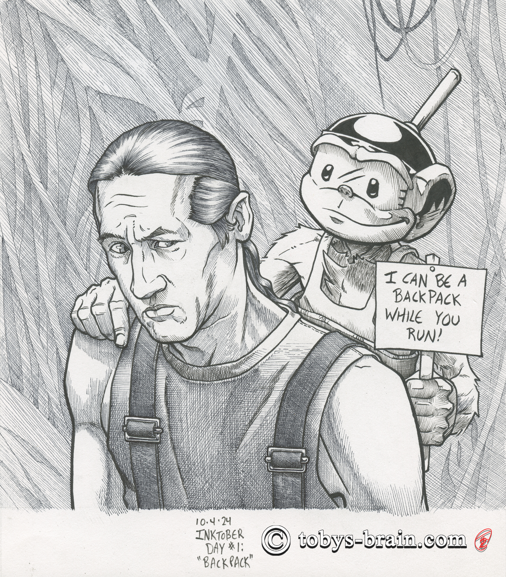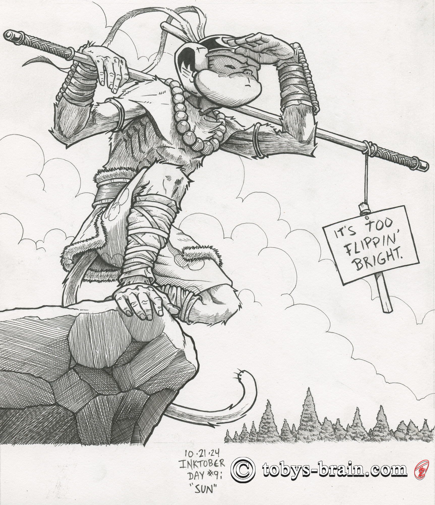 I have now amassed another three years’ worth of these here Plunger Monkey infused Inktober illustrations. For those that paid attention, you may recall I published a “little” book last year called Inklings (which you can get here), which compiled the first three years of Inktober illustrations I did since I decided to incorporate my plunger-wearing simian alter-ego. That kind of suggests I’m due to work on Inklings 2…I’m just not sure when or how to prioritize it. Volume one didn’t exactly sell for all the normal reasons: no one knows who I am, I didn’t advertise very well (or at all, really), and the nature of the printing required a higher cover price (especially for a no-name like myself). I like the way Inklings turned out, but some of the choices I made lead to some challenges and headaches. For example, creating all the custom page textures to make it look like an old illuminated manuscript meant having a full-bleed print on every page, which is expensive and finicky as slight shifts in the printing process sometimes leave a noticeable white edge on some pages after trimming. I’ve been told the colored pages also take away from the actual illustrations a bit, which “pop” more as just black and white. Then there’s all the additional decorative art I did and the custom fonts I designed, which took a long time. What I’m getting at is I have some decisions to make with regards to formatting and the overall look of future volumes, but that’s proving to be a little emotionally painful. I’m a bit obsessive compulsive about certain things, and the idea of producing future volumes of Inklings that look different – like doing away with the full bleed page textures – hurt my Brain. Things must be consistent!