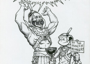 INKTOBER 2025 Day #9: HEAVY. “You’ve used barbells and dumbbells. Maybe you’ve even used kettlebells and clubbells. Now introducing the plate-loaded, fully adjustable Plungerbell! I have been working out