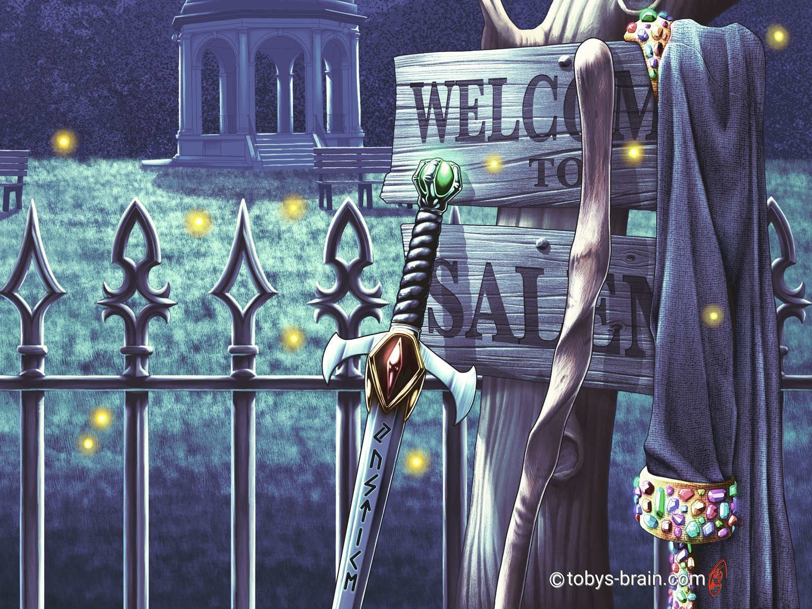 The final cover we decided to have at night. This one required a bunch of repainting, but not nearly as much as it could have, thanks to some of the other strategies I employed from the beginning (like the way I managed the layers and made use of File Objects). One of the challenges with these nighttime covers is that they can print way too dark, and it’s always a struggle to get them to print correctly. I’m still learning how combat that, but one of the strategies I tried here was to maintain some good contrast and to minimize how much actual black there is. Some of the colors and tones look dark because of the colors and tones next to them. The fireflies were an after thought, but the author approved. One of the thoughts I had had early on when we were discussing how to have these 5 unified covers without over cluttering them (the original idea was to have the sword on book 1 and add a new “prop” every cover, totaling 5. Despite my efforts, I couldn’t get 5 items in there without it being too cluttered) was to introduce some “magical” elements, since the books are about witches and warlocks and spell casting. The author didn’t have a strong idea for a particular spell that was visual, but the fireflies kind of fill that purpose for me (I wanted to try painting some glowing magical stuff, haha).