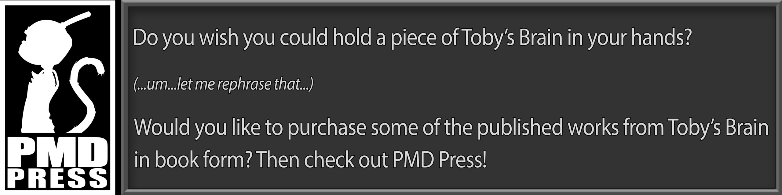 Take an even deeper dive into my Brain! My debut art book collects three years worth of Inktober challenge illustrations featuring none other than Plunger Monkey Dynamo! Enjoy the unique and amusing ways PMD interprets each of the official Inktober prompts in over 90 unique pen and ink drawings, each with definitions, explanations, and a peek at the inner workings of Toby’s Brain! Join the growing fan-base of everyone’s favorite plunger-wearing monkey!